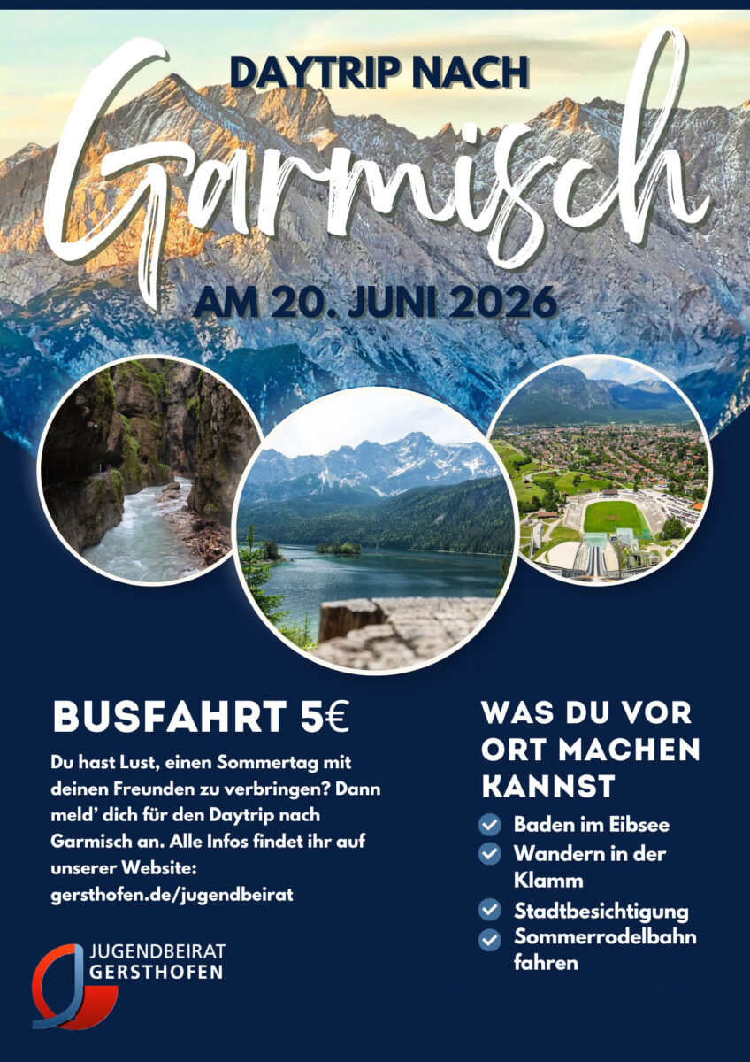Bitte aktiviere JavaScript in deinem Browser, um dieses Formular fertigzustellen.Bitte aktiviere JavaScript in deinem Browser, um dieses Formular fertigzustellen.Kommt alle mit! Lust auf einen unvergesslichen Tagesausflug in die Berge? Dann kommt mit dem Jugendbeirat der Stadt Gersthofen mit nach Garmisch! Der Jugendbeirat organisiert am 20.06.2026 eine entspannte Busfahrt von Gersthofen aus – und das für unschlagbare nur 5 Euro. Perfekt, um dem Alltag zu entfliehen und frische Bergluft zu schnuppern! In Garmisch habt ihr die volle Freiheit: Ob gemütlich durch den Ort bummeln, die Natur genießen oder einfach die Seele baumeln lassen – ihr entscheidet selbst, wie ihr euren Tag gestaltet. Für alle, die Lust auf ein kleines Abenteuer haben, bieten wir zudem an, gemeinsam mit uns die beeindruckende Partnachklamm zu erkunden – ein echtes Naturhighlight! Am Abend, gegen 19 Uhr, sind wir wieder zurück in Gersthofen – mit vielen schönen Erinnerungen im Gepäck. Seid dabei und erlebt einen großartigen Tag in den Alpen! Anmeldung zum Ausflug nach Garmisch Name *VornameNachnameGeburtsdatum *Straße und Hausnummer *PLZ *Ort * Ich im Straße Handy-Nummer (Teilnehmer:in) *Notfalltelefonnummer (U18 verpflichtend)Ich buche verbindlich: *Nur Busfahrt5 EuroBus und Eintritt Partnachklamm (U18)9 EuroBus und Eintritt Partnachklamm (Ü18)14 EuroEinstieg in … *Gersthofen Paul-Klee-GymnasiumSchubertstraßeBatzenhofenMehrzweckhalleAusstieg (wird im Bus erneut abgefragt) *OlympiaschanzeEibseeIhre Anmeldung zum Daytrip nach Garmisch ist erst nach Zahlungseingang auf dem Konto der Stadt Gersthofen verbindlich. Verwendungszweck: Fahrt Jugendbeirat IBAN: DE78 7315 0000 0000 1752 16 BIC: BYLADEM1MLM Hinweis *Für etwaige Schäden (ausgenommen vorsätzliche Schädigungen sowie vorsätzliche und fahrlässige Schäden an Leben, Körper oder Gesundheit) übernimmt der Veranstalter, der Jugendbeirat Gersthofen, keine Haftung. Der Jugendbeirat übernimmt keine Beaufsichtigung. Für minderjährige Teilnehmer:innen ist das Ausfüllen der Einverständniserklärung verpflichtend.Absenden
