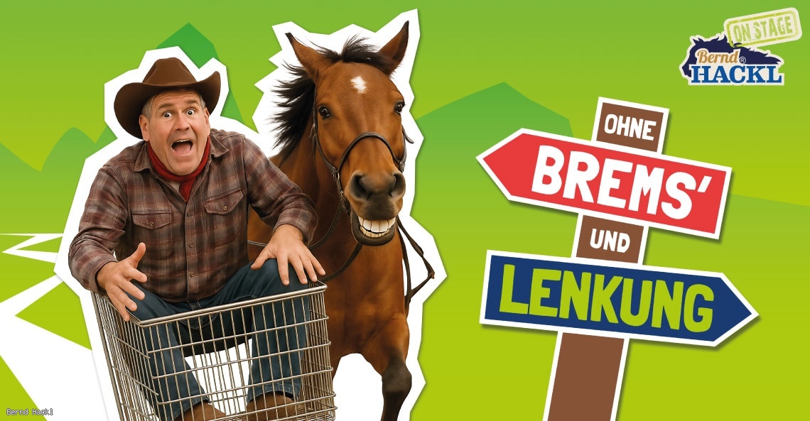Mit seinem brandneuen Programm „Ohne Brems’ und Lenkung“ geht Pferdetrainer Bernd Hackl in die zweite Runde – nicht im Sattel, sondern auf der Bühne und diesmal wird’s noch wilder, noch schräger und garantiert bauchmuskelstrapazierend!