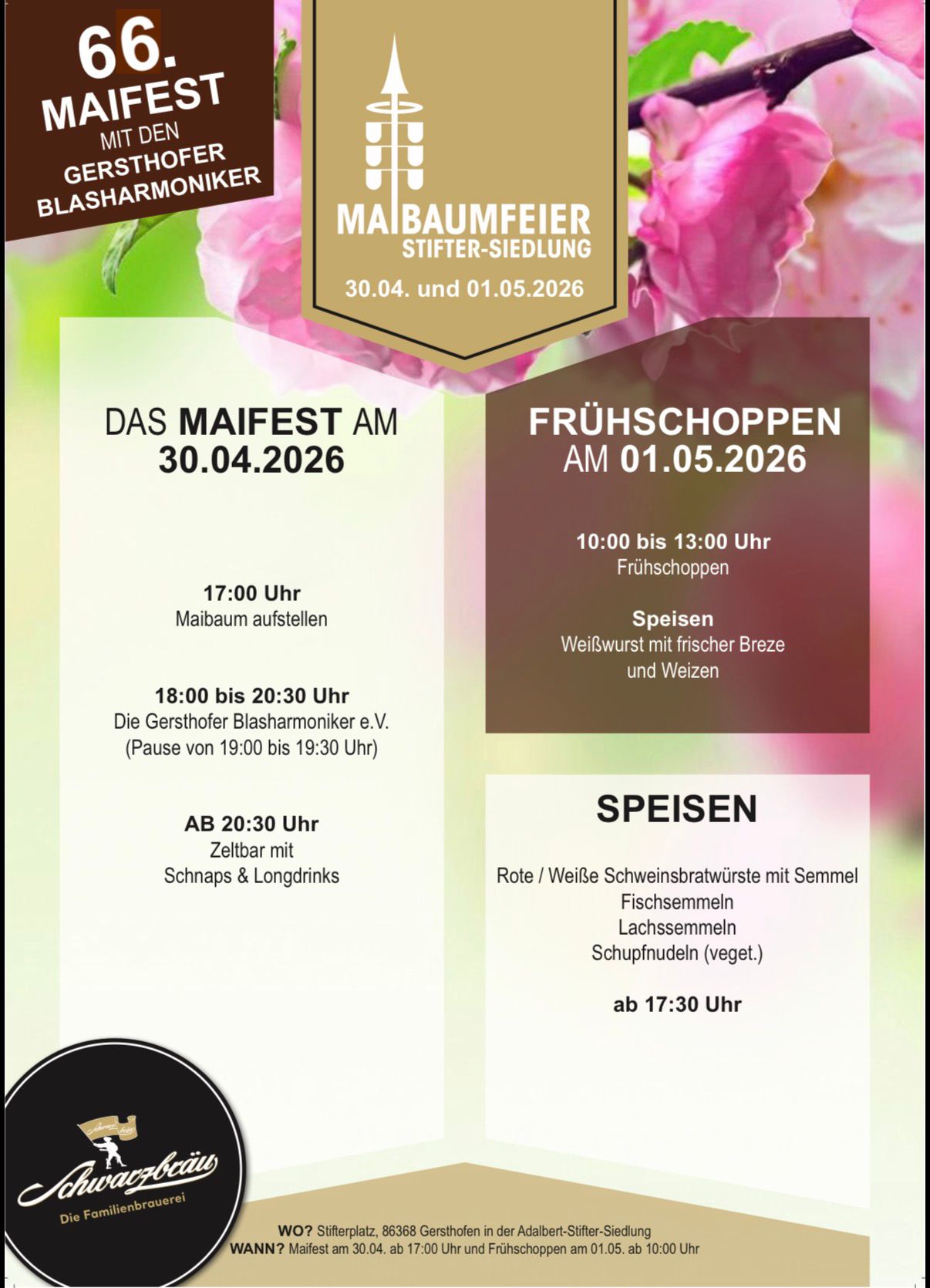 Das 66. Maifest in der Adalbert-Stifter-Siedlung in Gersthofen! Freuen Sie sich am 30.04.2026 ab 17 Uhr auf das traditionelle Maibaum-Stellen - noch per Hand und Muskelkraft! Für Speis und Trank sorgen die Maibaumfreunde Stifter-Siedlung n.e.V., die Gersthofer Blasharmoniker sorgen für die stimmungsvolle musikalische Umrahmung. Am 01.05. wird ab 10 Uhr zum zünftigen Frühschoppen mit Weißwurstfrühstück geladen.