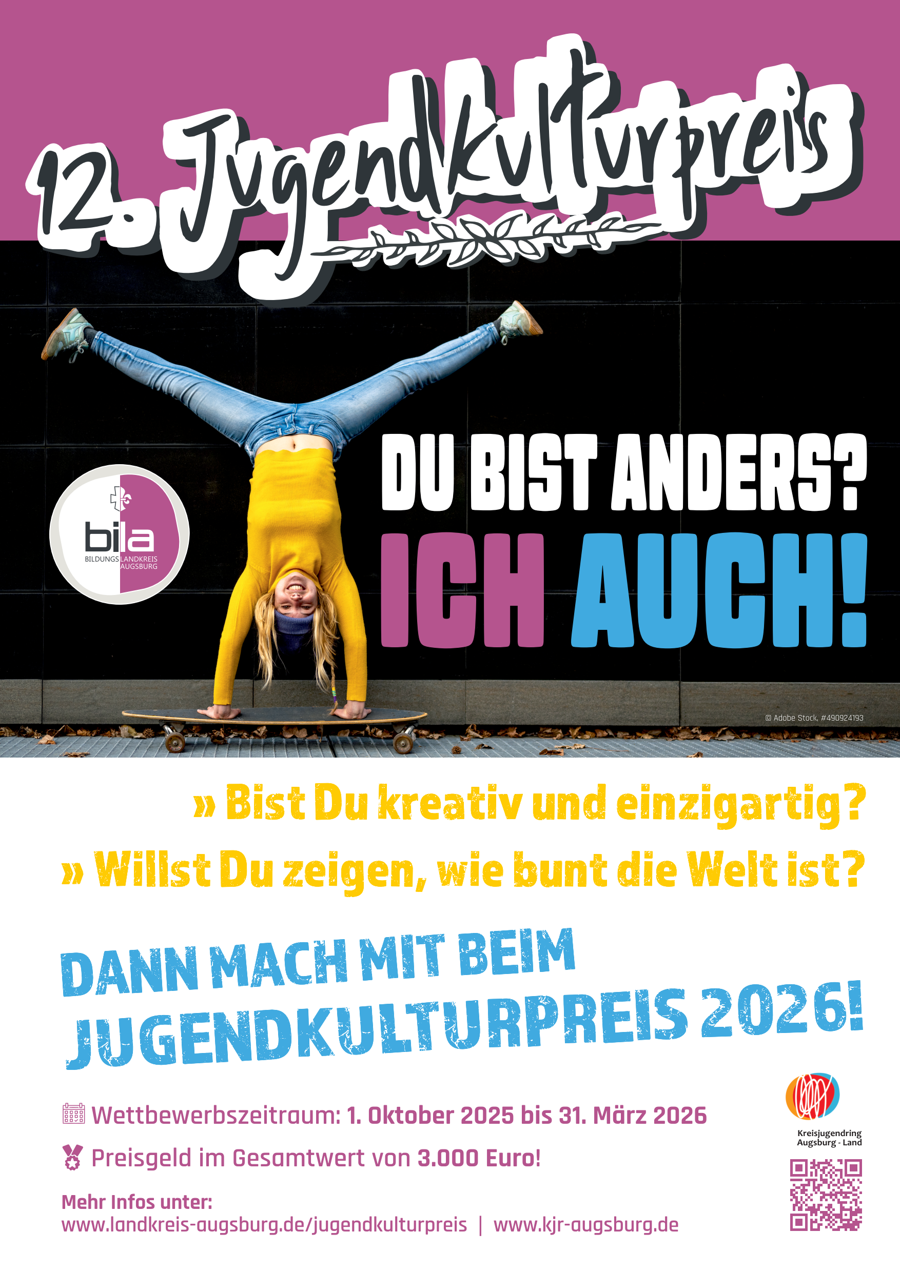 Alle 2 Jahre fördert und würdigt der Landkreis Augsburg künstlerisches Schaffen von Kindern und Jugendlichen im Alter von 12 bis 26 Jahren mit insgesamt 3.000 € Preisgeld. Infos zum 12. Jugendkulturpreis 2026