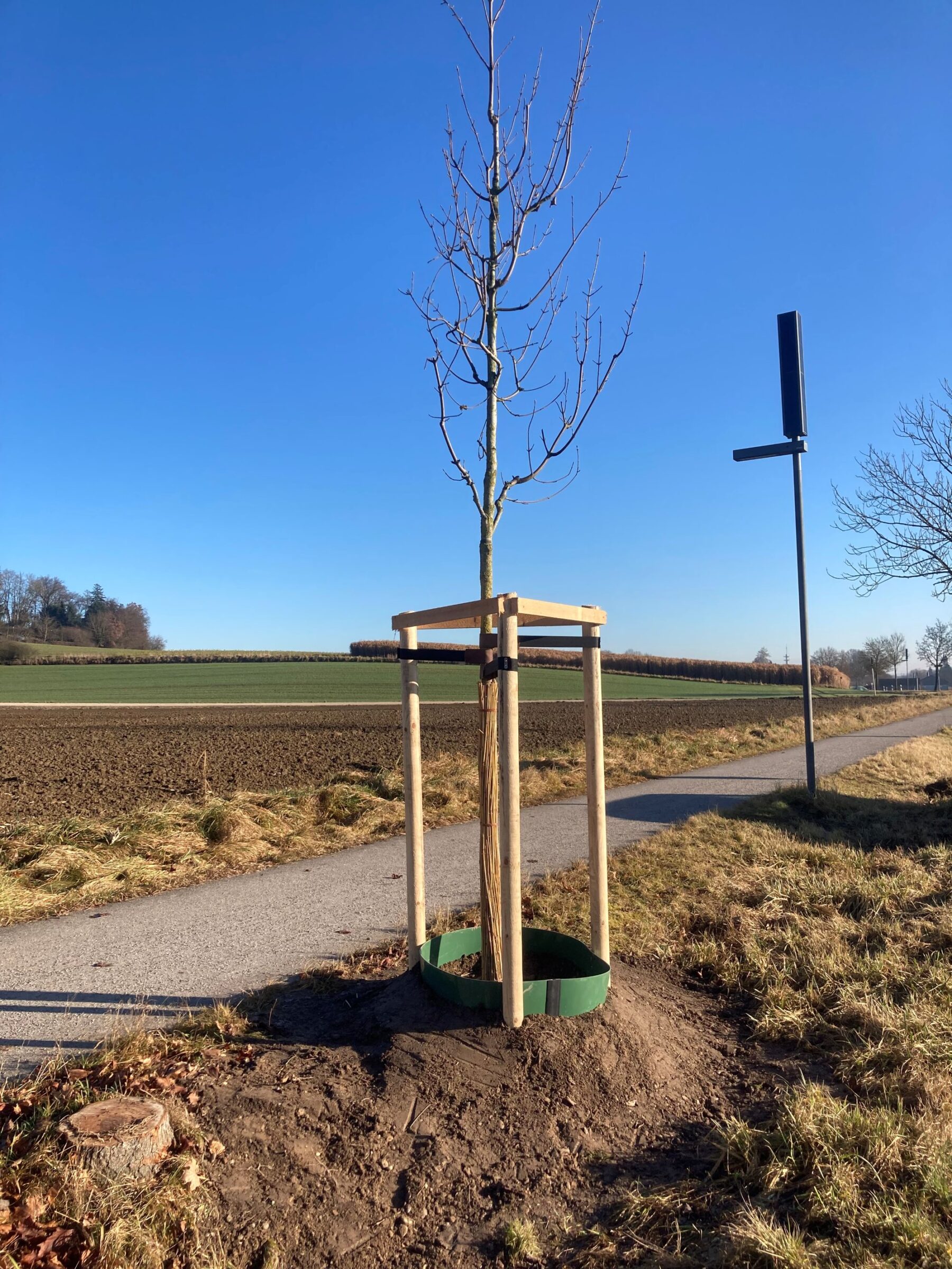 Die Baumpflanzungen fanden im klassischen Pflanzzeitraum im Herbst/Winter statt. Dieser Zeitraum – ebenso wie das zeitige Frühjahr – gilt als besonders geeignet für Neupflanzungen, da sich die Bäume in der Vegetationsruhe befinden. In dieser Phase können sie ihre Energie auf die Ausbildung eines stabilen Wurzelwerks konzentrieren, ohne zusätzlich Blätter oder Früchte versorgen zu müssen. So wachsen die Bäume besser an und sind widerstandsfähiger gegenüber Trockenheit und Hitze in den Sommermonaten.