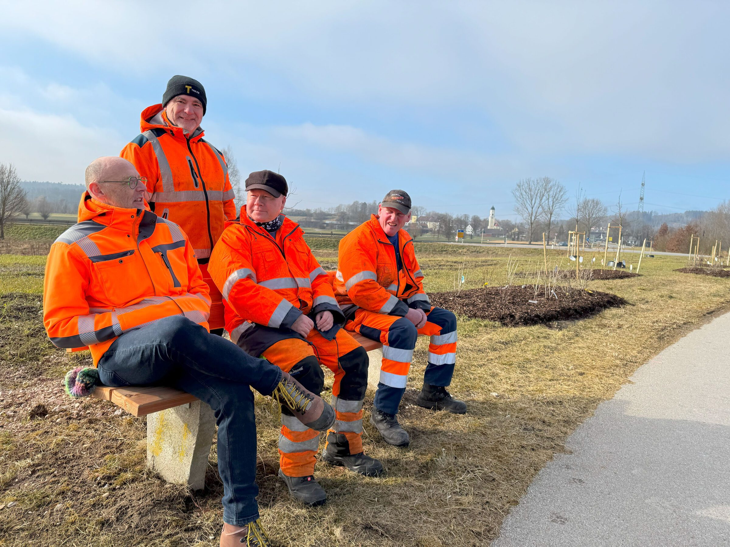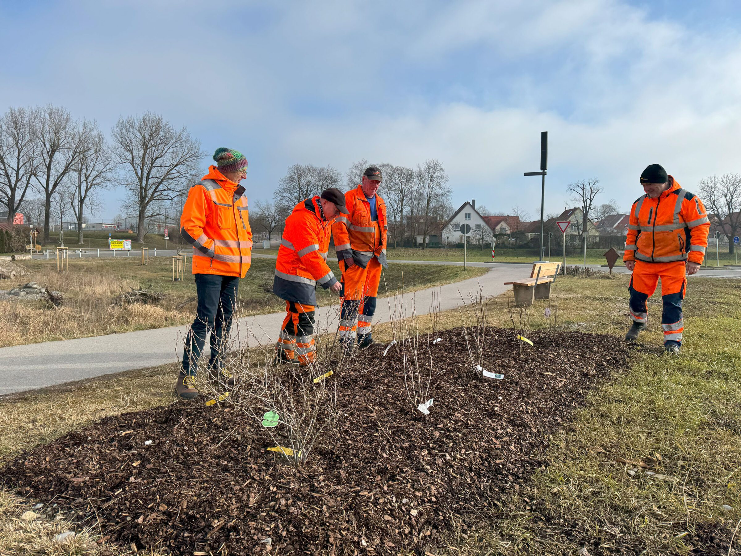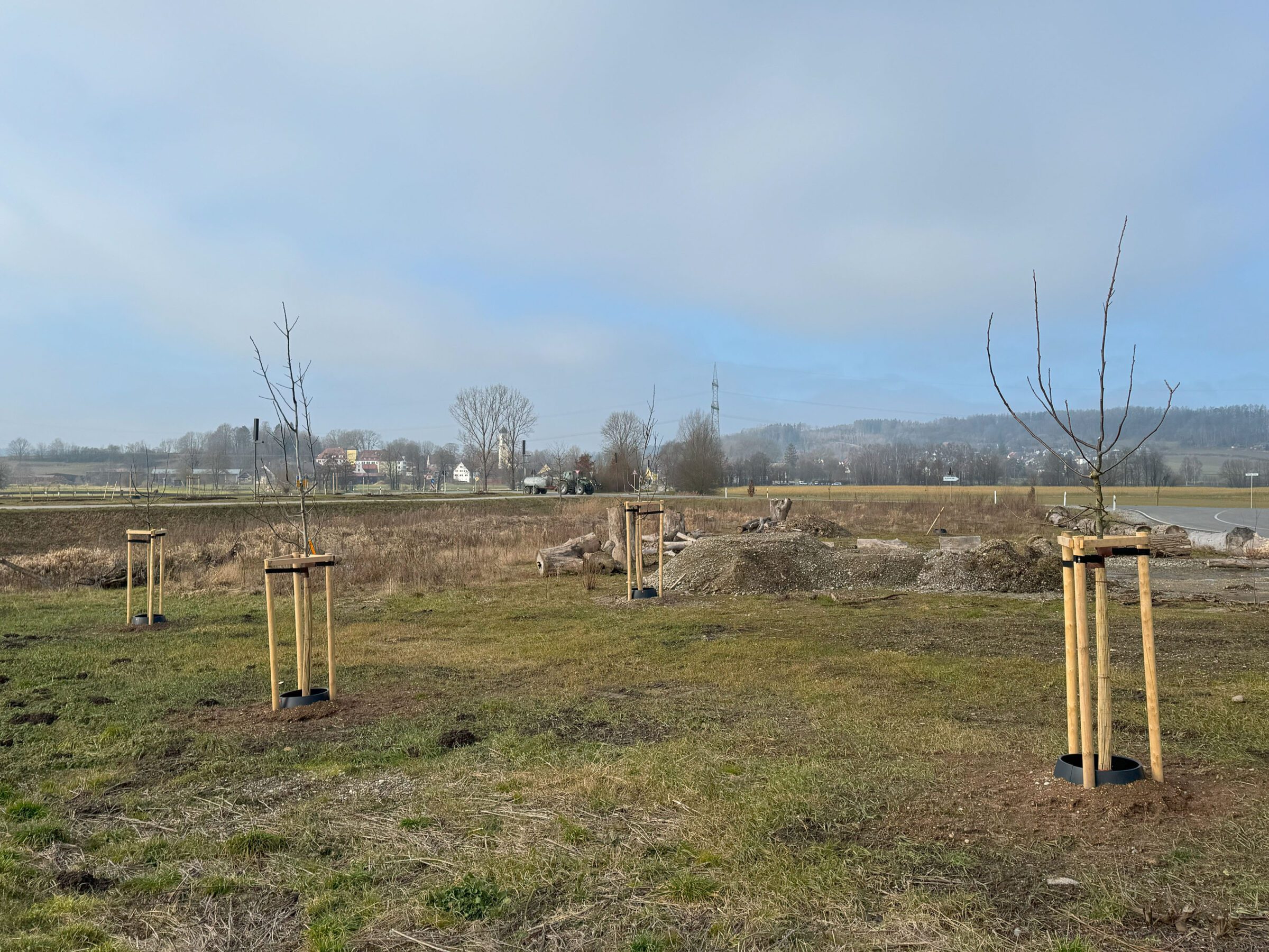Noch sind alle Bäume und Büsche klein, doch in den nächsten Jahren wird hier am Ortseingang ein kleiner, grüner Platz wachsen, der sowohl Besucher und Besucherinnen, als auch Hirblinger:innen im Sommer mit gesundem, leckerem Obst verpflegt und gleichzeitig schön anzuschauen sein wird.
