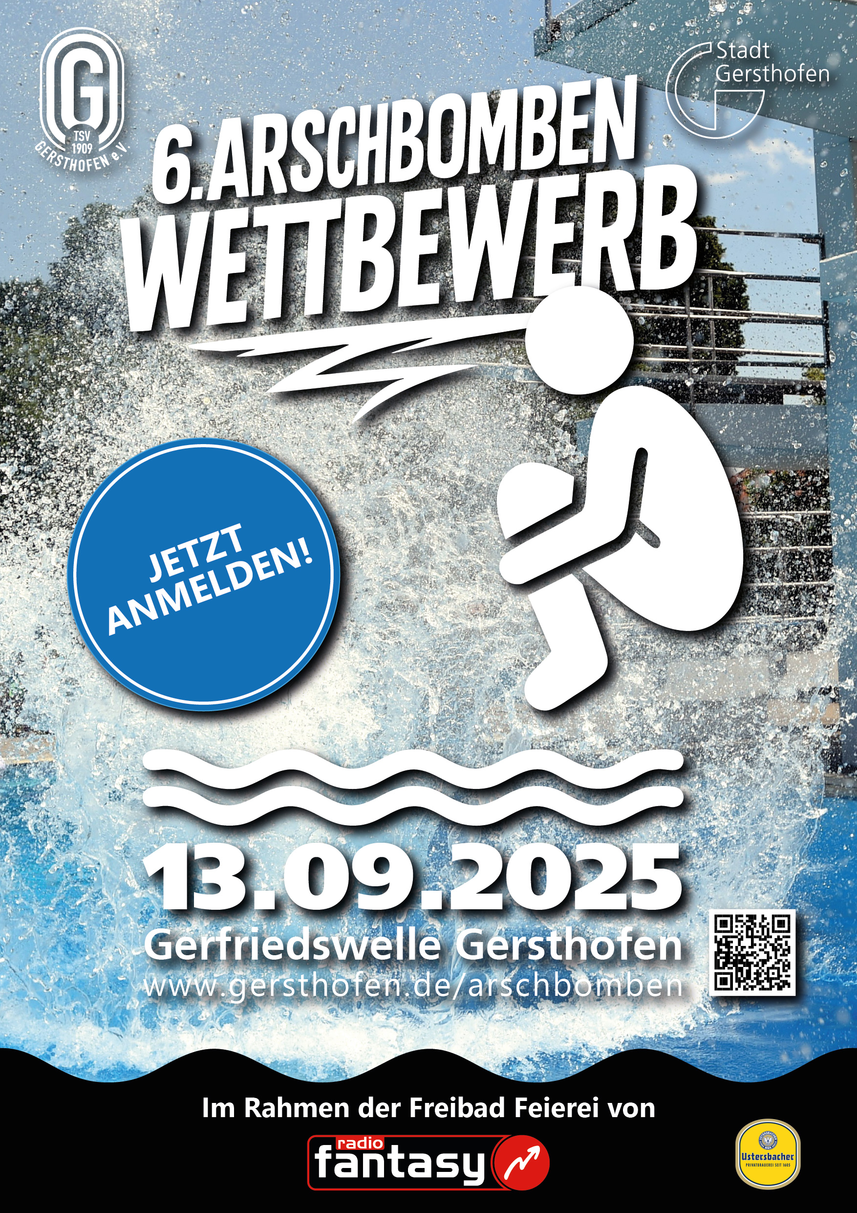 Am Samstag, den 13. September 2025, wird es in der Gerfriedswelle Gersthofen laut, spritzig und musikalisch: Von 14 bis 18 Uhr steigt der 6. Arschbomben-Wettbewerb im Rahmen der Freibad Feierei von Radio Fantasy.