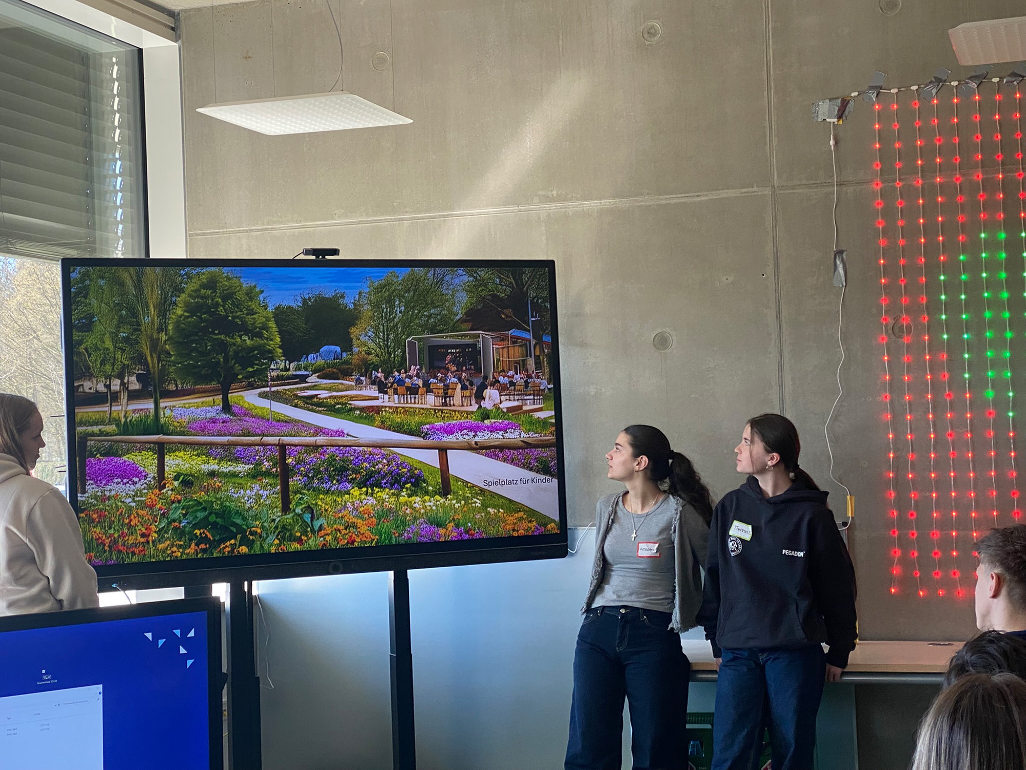 Auffällig war, dass alle viel Wert auf Grün legten – auf allen Bildern waren Bäume, Blumenwiesen oder große Parkanlagen zu sehen. Dazu kamen Sportflächen, Marktstände, Brunnen, viele verschiedene Sitzmöglichkeiten und Wasserspiele. Kreative Ideen wie Flussläufe durch den Park, eine Eislauffläche im Winter oder ein Platz für Sommerkino und Theater rundeten die Planungen der Jugendlichen ab. Alle Teilnehmenden waren die gesamten drei Stunden mit großer Begeisterung dabei und hatten viel Spaß am Planspiel.
