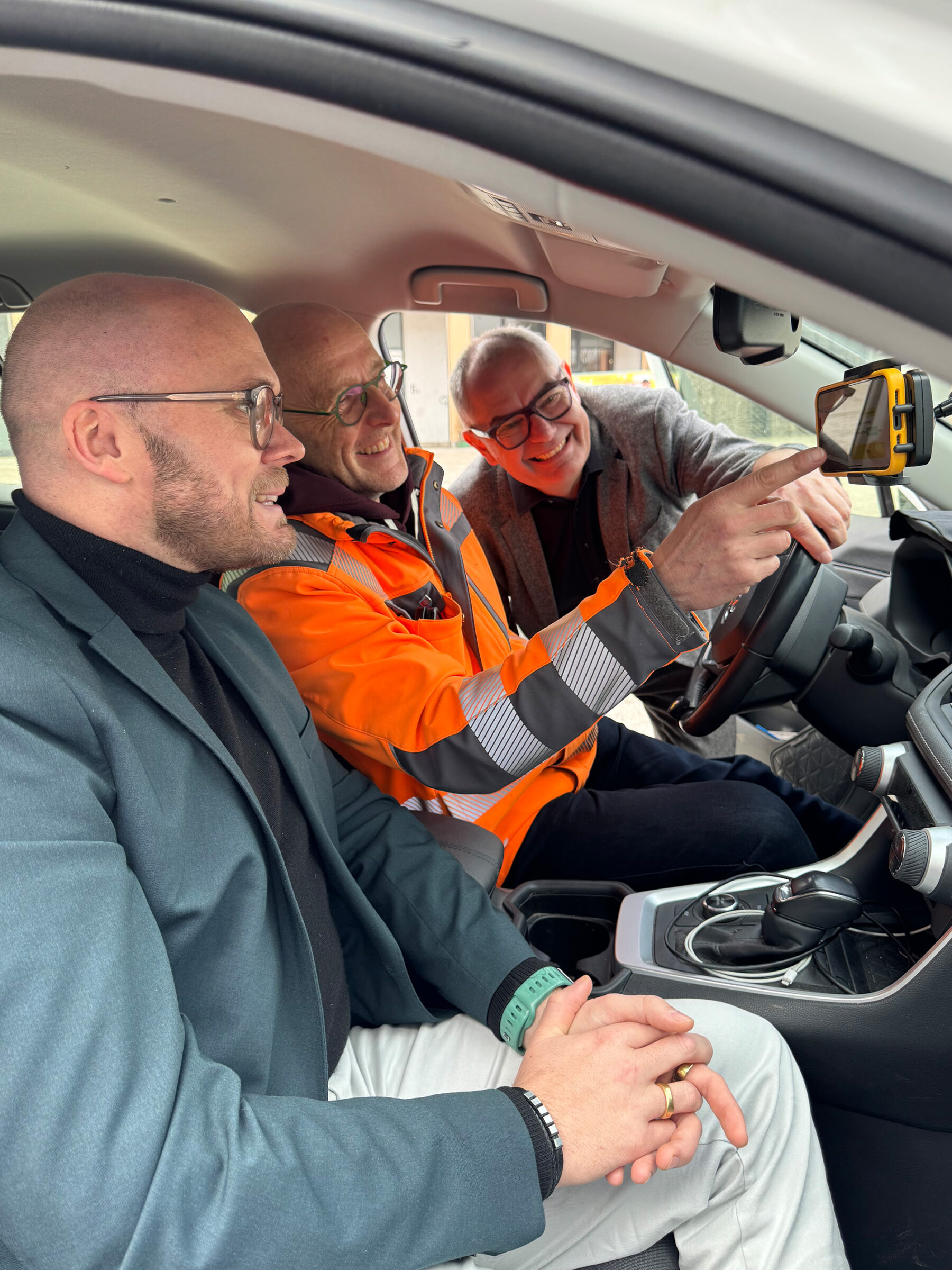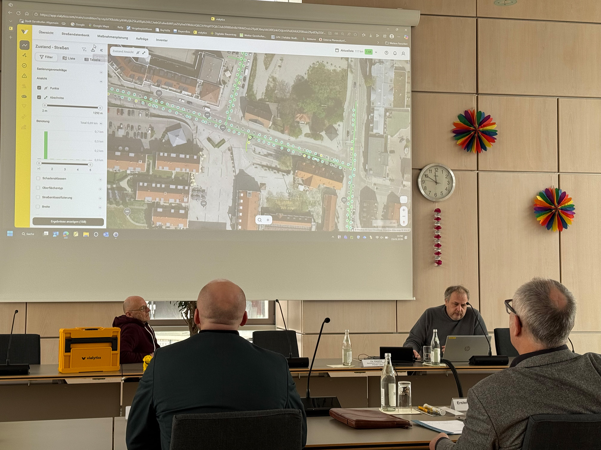 Während des Besuchs wurde das intelligente System der Firma vialytics vorgestellt. Hierbei erfassen Smartphones an städtischen Fahrzeugen während der Fahrt automatisch den Zustand der Verkehrswege. Eine KI analysiert die Bilder, erkennt Schäden und kategorisiert diese eigenständig. Das Ergebnis ist ein digitaler Zwilling des Straßennetzes, der Reparaturen planbar macht und die Verkehrssicherungspflicht rechtssicher dokumentiert.