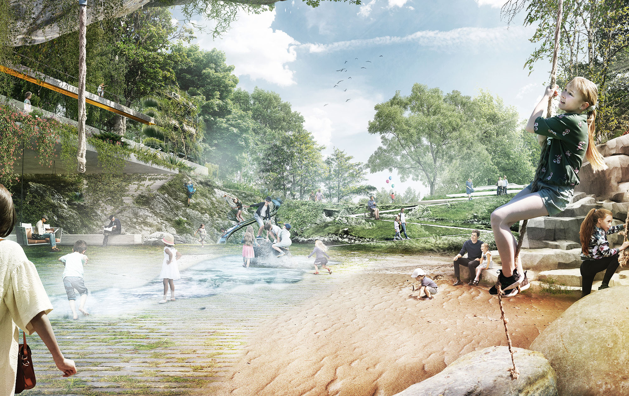 Welche Verbindungen zur neuen Mitte gibt es? Welche zum Rathaus/City-Center, welche Topografien/Sichtachsen kann ich heute schon wahrnehmen? Wie könnte sich der neue Park anfühlen? Wie könnte eine Verbindung von oben und unten auf der Potenzialfläche sein?