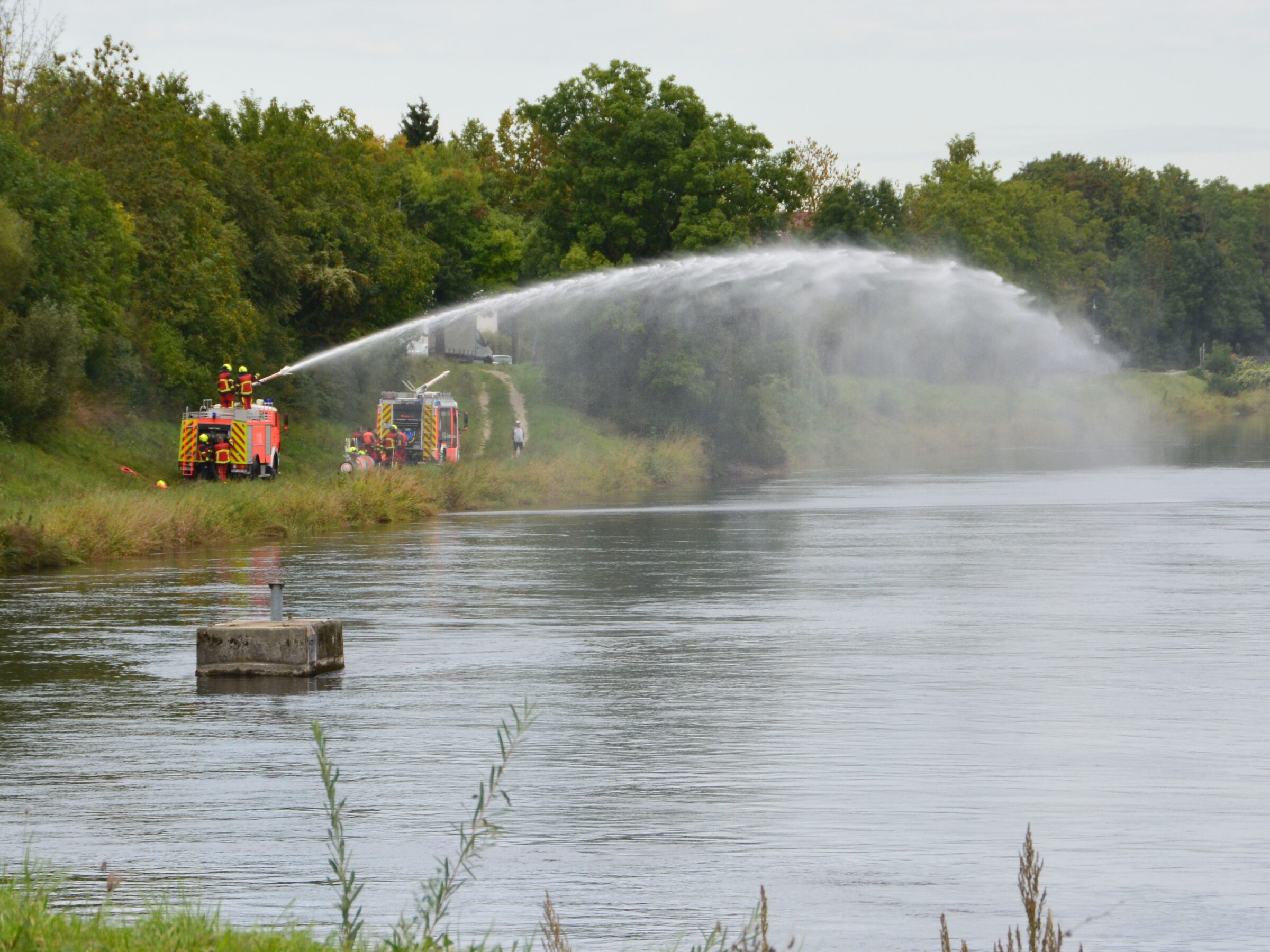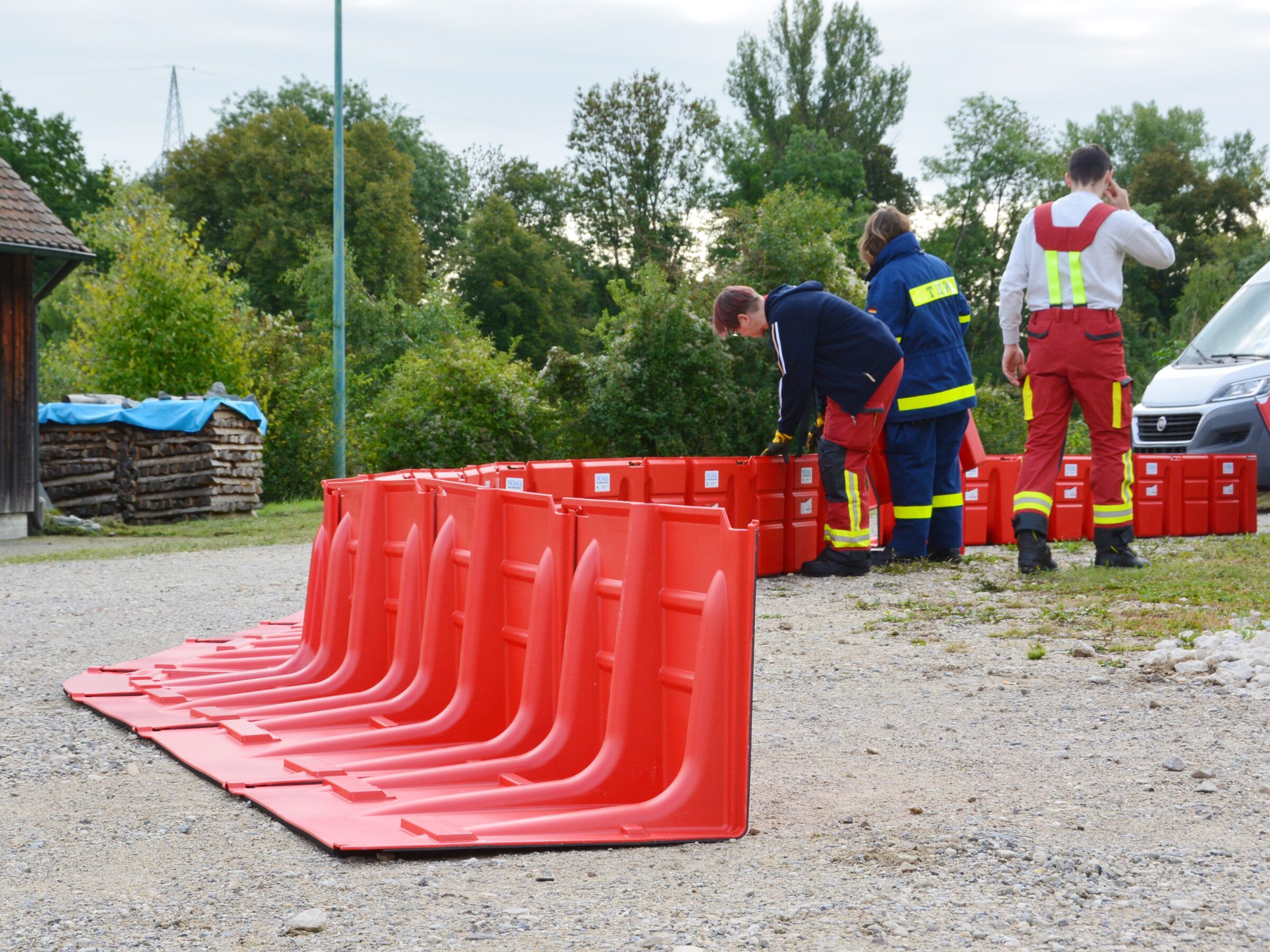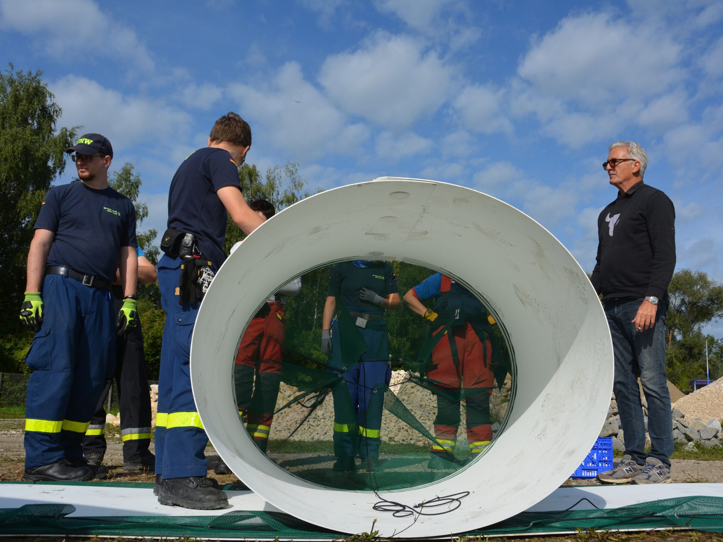 Schutzmaßnahmen bei Extremhochwasser im Praxistest: LEW, THW, Wasserwachten und Freiwillige Feuerwehren trainieren in Gersthofen – erstmals gezielte Sprengung eines Musterdeichs.