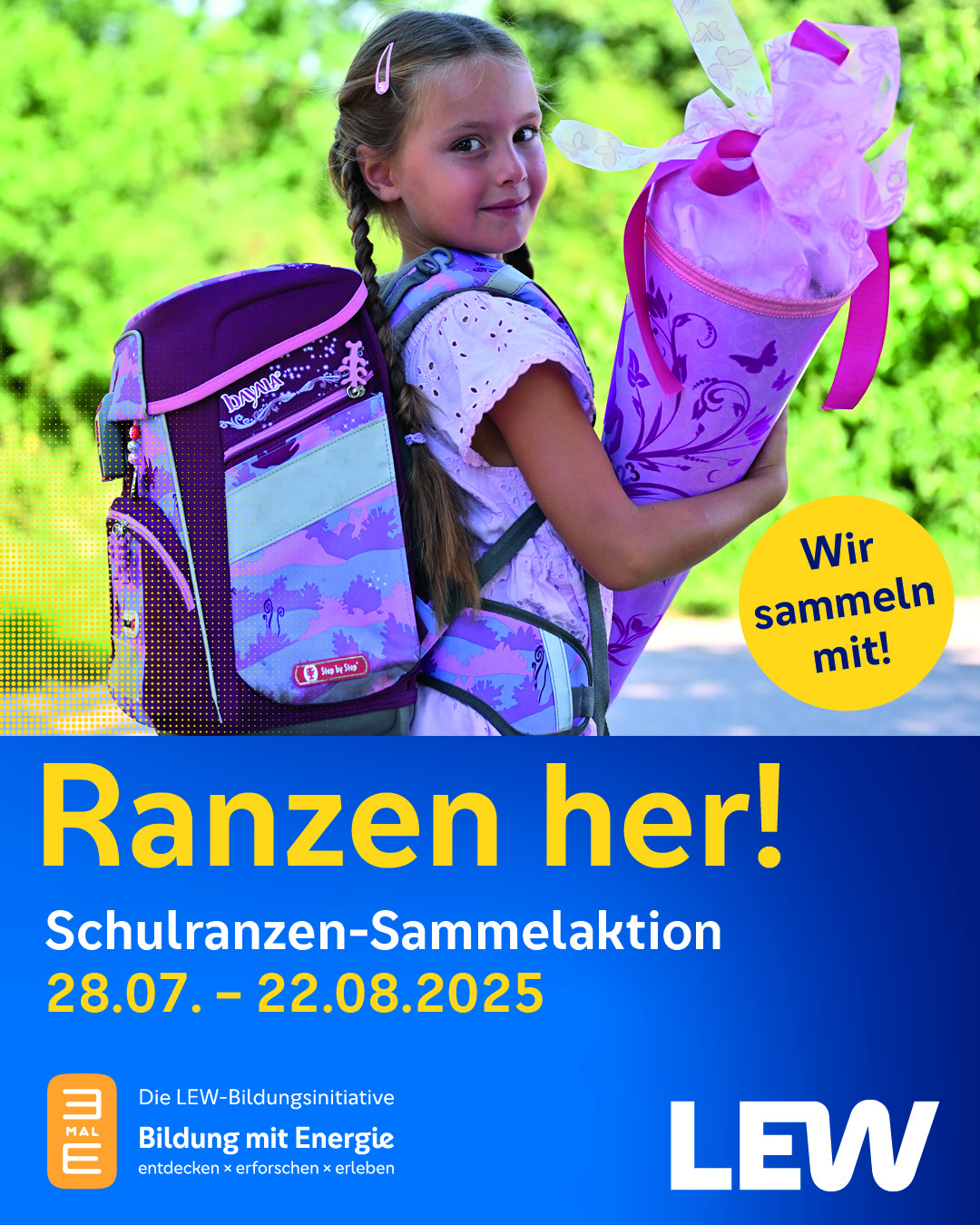 Viele Kinder freuen sich auf ihren ersten Schultag. Für Familien mit geringem Einkommen ist dieser Tag aber oft mit finanziellen Sorgen verbunden. Um sie zu entlasten, ruft die LEW-Bildungsinitiative 3malE auch in diesem Jahr zur Aktion „Ranzen her!“ auf. Gesammelt werden gut erhaltene Schulranzen und -rucksäcke, die an Kinder in Bayerisch-Schwaben und angrenzenden Regionen weitergegeben werden.