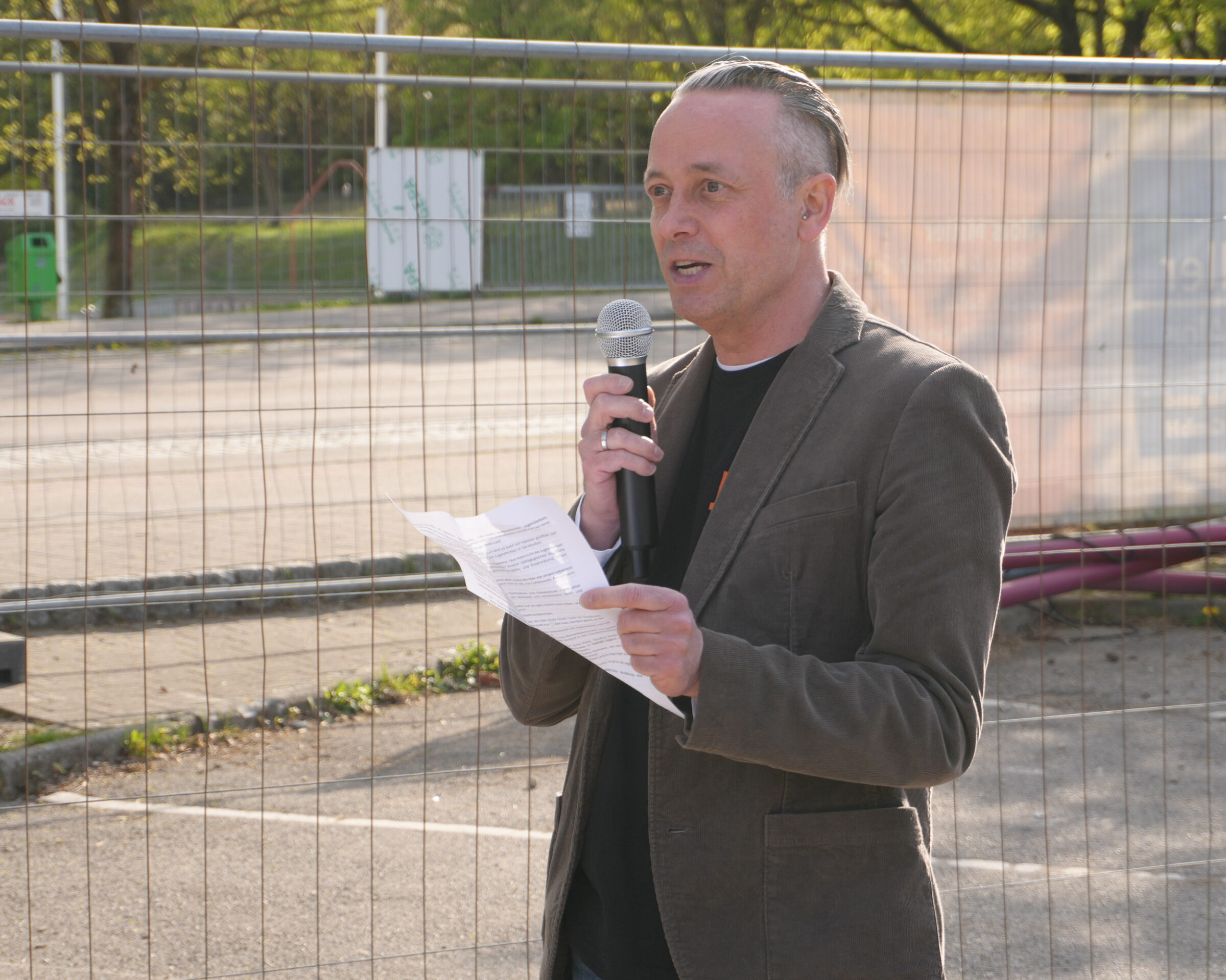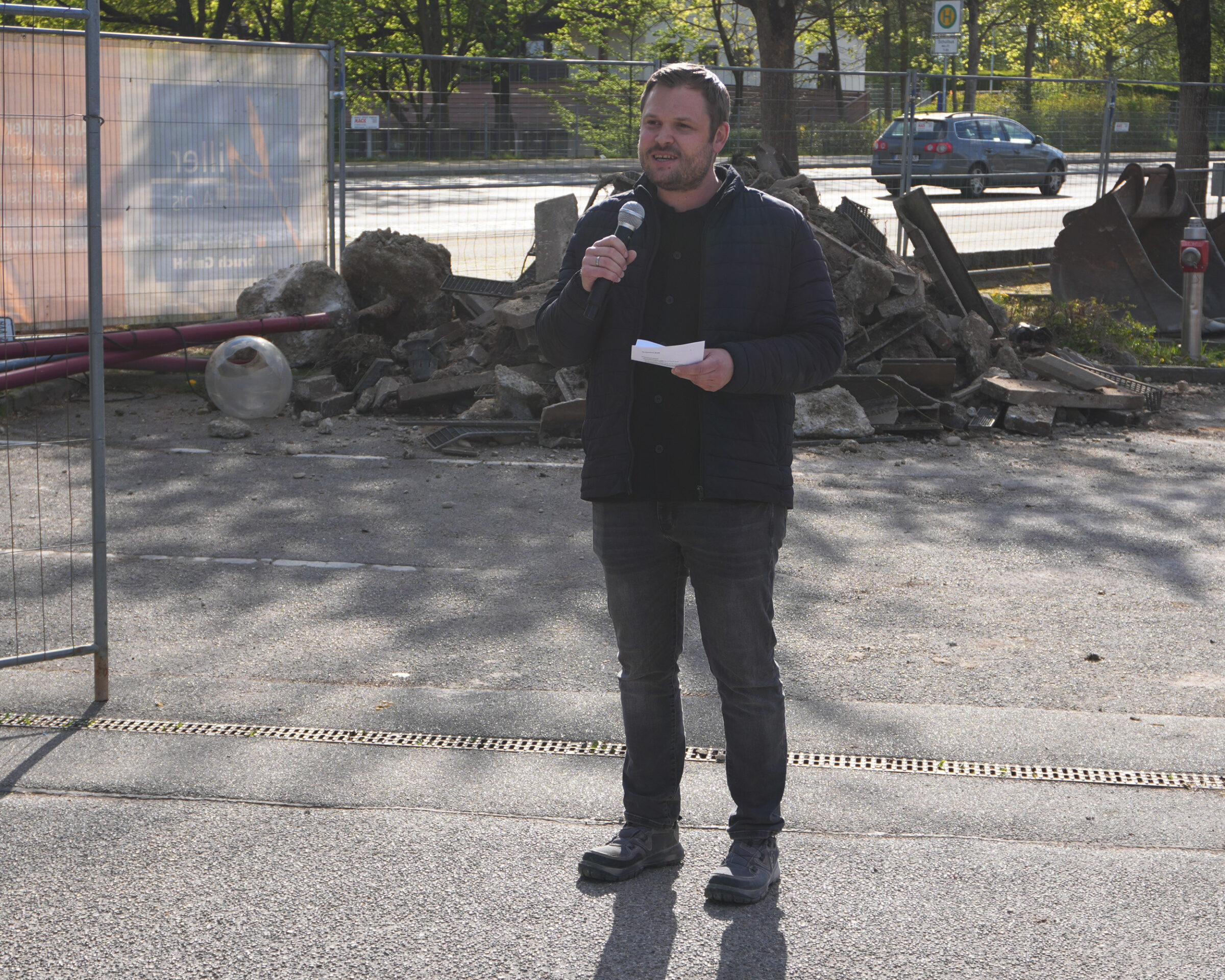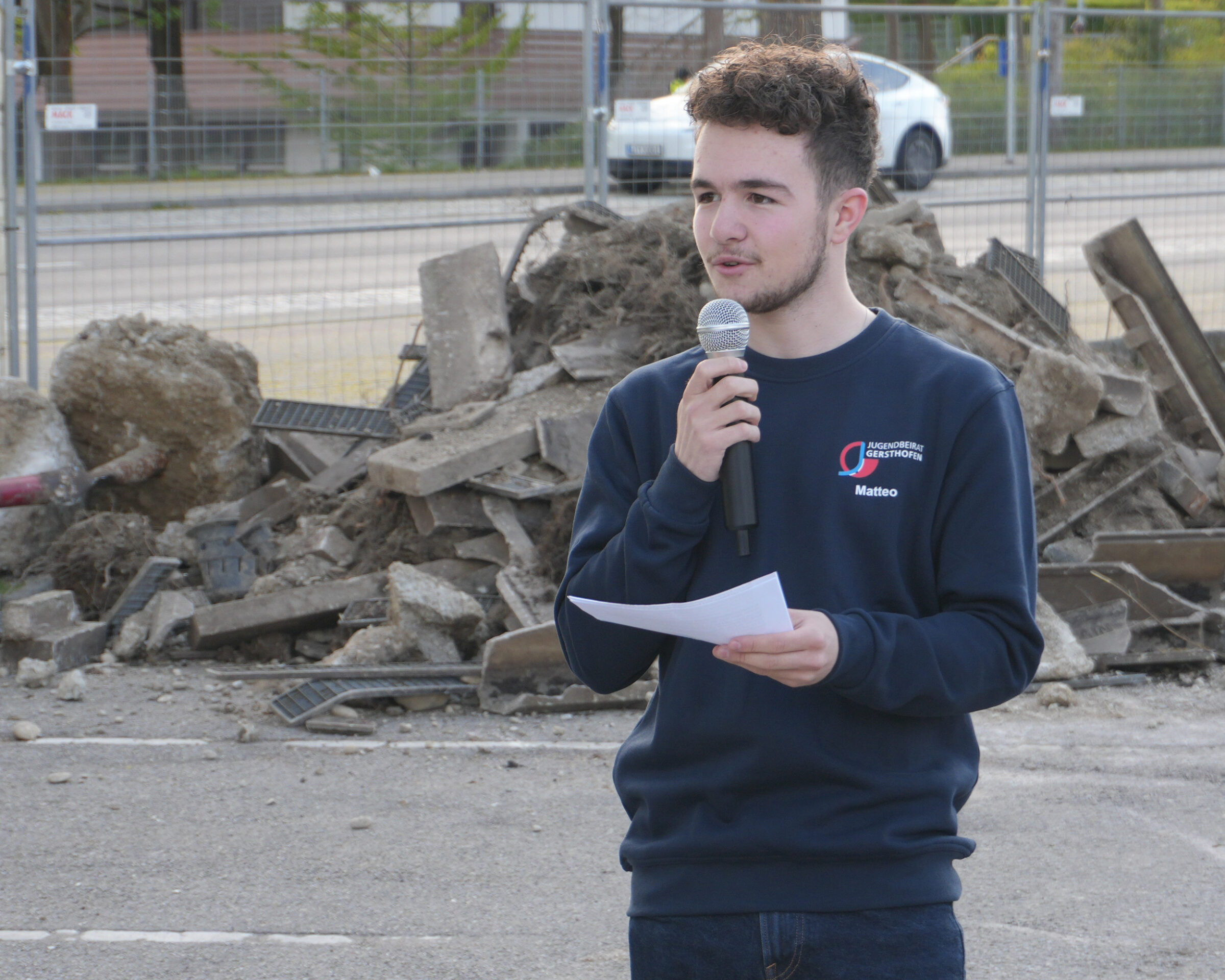 Im Anschluss stellte Markus Naß, Stadtbaumeister, seine Gedanken zum Projekt vor und wünschte allen beteiligten Gewerken ein gutes und unfallfreies Gelingen. Andreas Haas von Haas Architekten ging in seiner Rede auf die baulichen Ansätze des neuen Jugendzentrums ein. Markus Wolf, Sachgebietsleitung Jugend, schilderte unter anderem den langen Prozess bis zum Spatenstich für das neue Jugendzentrum aus seiner Sicht. Bevor es dann zum eigentlichen Spatenstich ging, ergriff Matteo Gugliotta, 1. Vorsitzender Jugendbeirat, das Wort und bedankte sich für den guten Austausch mit Politik und Verwaltung und betonte, dass viele Ideen des Jugendbeirats in das Projekt eingeflossen sind.