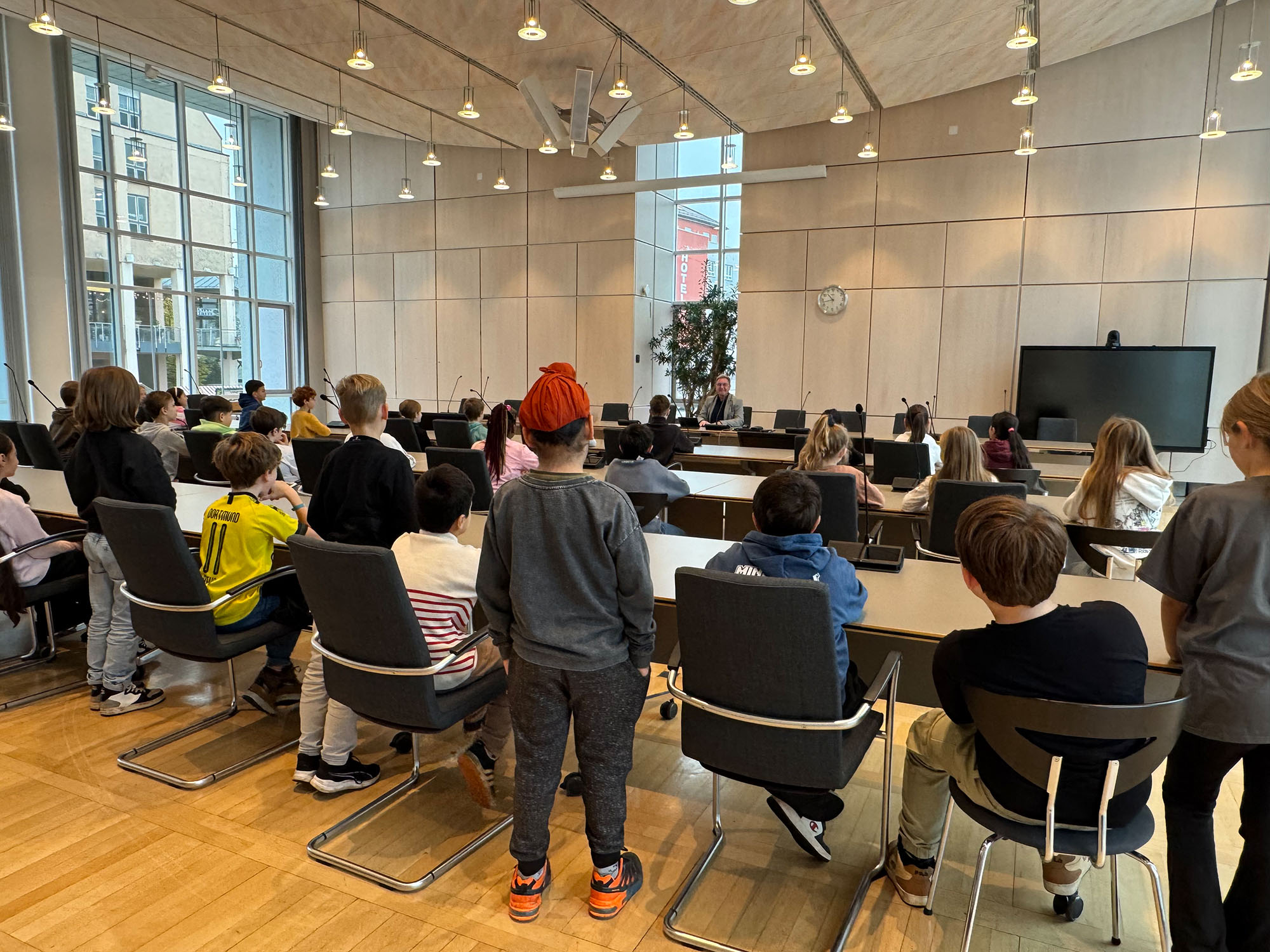 Auf einem spannenden Rundgang lernten die Kinder, was mit Fundsachen passiert, wo geheiratet wird und welche Aufgaben der Stadtrat hat. Im großen Sitzungssaal der Stadt durften sie Reinhold Dempf, dem zweiten Bürgermeister, Fragen stellen.