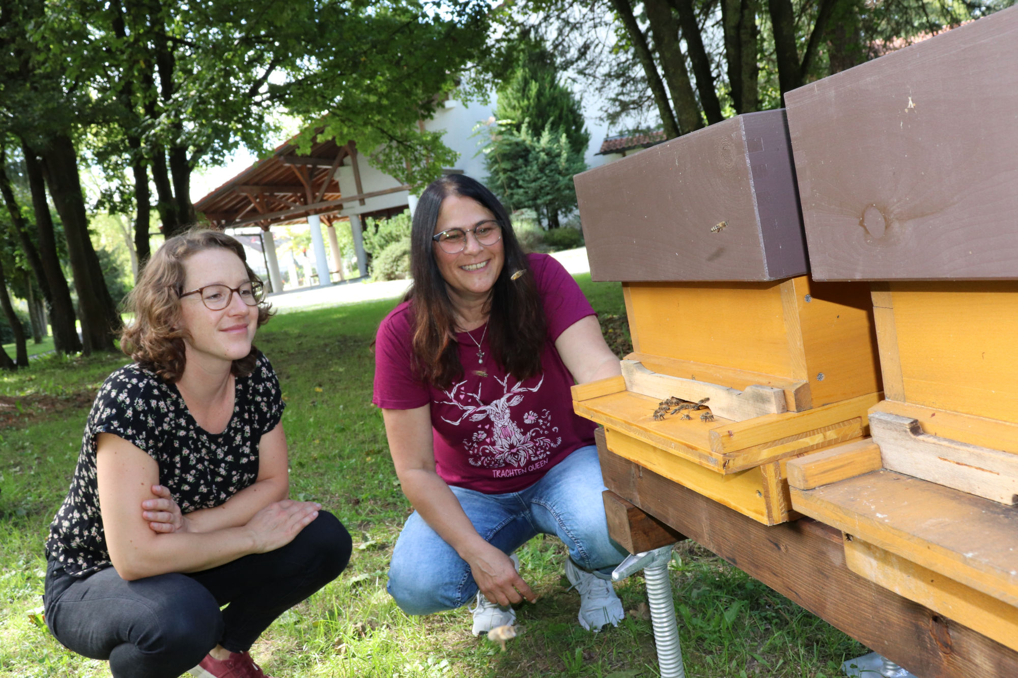 Klimamanagerin Julia Ferstl (links im Bild) freut sich gemeinsam mit Bienen-Expertin Monika Jäger über die beiden Bienen-Volker auf dem Gersthofer Friedhof.
